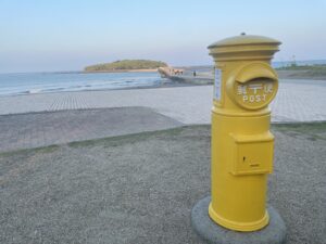 海に浮かぶ青島神社はパワースポットとしても有名だそうです。黄色のポストのバックに浮かぶジャングルが青島神社です。